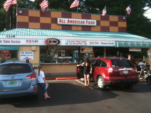 My husband Steve adores A&W. A few years ago when he discovered that there was an A&W in Lake George- a scant 45 minutes away from our house- and that it was a nifty car park one with window trays and everything- well we had to go eat there! Right away!! Consequently A&W is the only “fast food” restaurant our kids are familiar with. They don’t even have indoor seating- if you’re like us and choose not to eat in your car they have picnic tables. Consequently, they are only open for the oh-so-fleeting and ever-so-touristy Lake George summer.