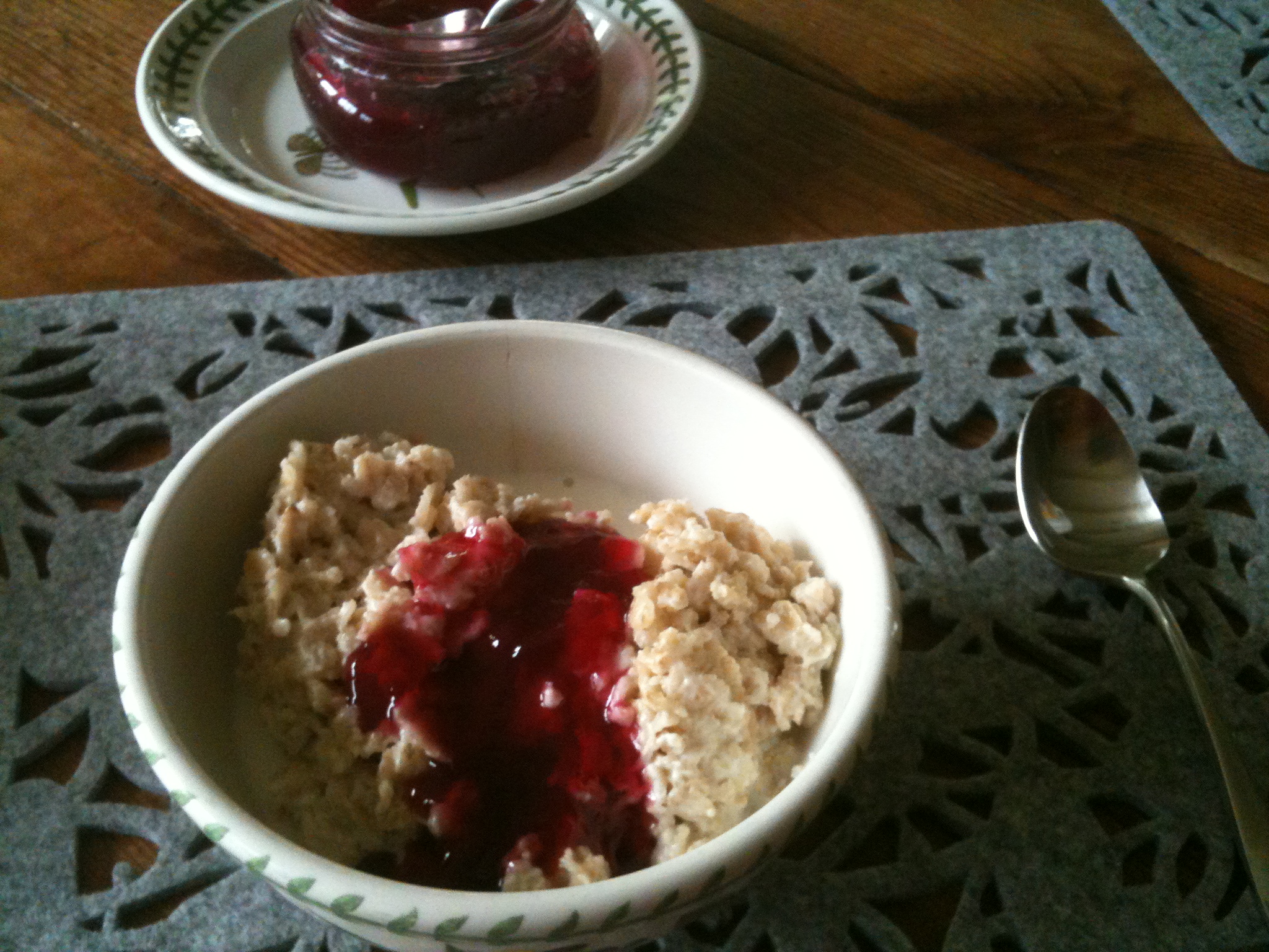 At this part of the procedure, with the boiling fruit in one pot and empty glass jars sterilizing surgically in another, I always feel like I’m engaged in some wonderful alchemical process that will transform some delicious but humble fruit into pure edible magic. They’re so beautiful, jars of jam in translucent hues sitting glinting on our shelves, waiting to remind us in the depths of a Vermont winter what the tastes of summer were. In the case of our concord grapes it’s even better because they’re free: the things grow like weeds in our backyard, no matter how badly we treat them, but due to the seeds and skins they aren’t much of a tasty snack. Without the jelly, this wonderful taste would pretty much go to waste, enjoyed by our backyard birds alone.