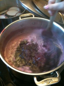 So I followed the recipe. After boiling the intense, incredibly purple juice for ten minutes I added ¼ cup of dextrose (instead of the called-for sugar) to a bowl containing the pectin powder and stirred this into the pot. (This is an extra step which you do with what I buy, which is “Low-Sugar Pectin”: it enables you to use less sugar in your jam, say five cups of sugar instead of seven. Seriously.) Brought to a boil, I then added the rest of the dextrose- 3 ½ more cups. Boiled exactly one minute, and then removed from heat and I began ladling into sterilized jars.