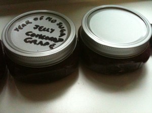 Among my many experiments this year I tried making a No-Sugar Grape Jelly. I had my work cut out for me: if you’ve never made jelly or jam then you might be astounded to know exactly how much sugar actually goes in the average batch. It’s not uncommon at all for a batch of, say, blueberry jam to call for seven cups of sugar. Yes. Seven. This works out roughly to a cup of sugar per pint jar. Think of that the next time you have toast.