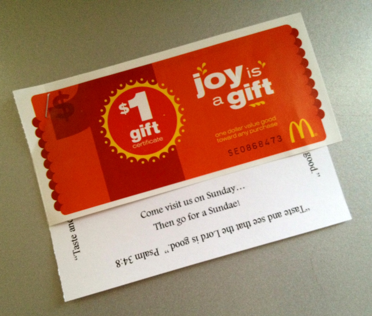 Then I got to the coupon for McDonalds. Stapled to it was a card that read “Come visit us on Sunday… Then go for a Sundae!” and quoted the Psalms “Taste and see that the Lord is good.” I kid you not.