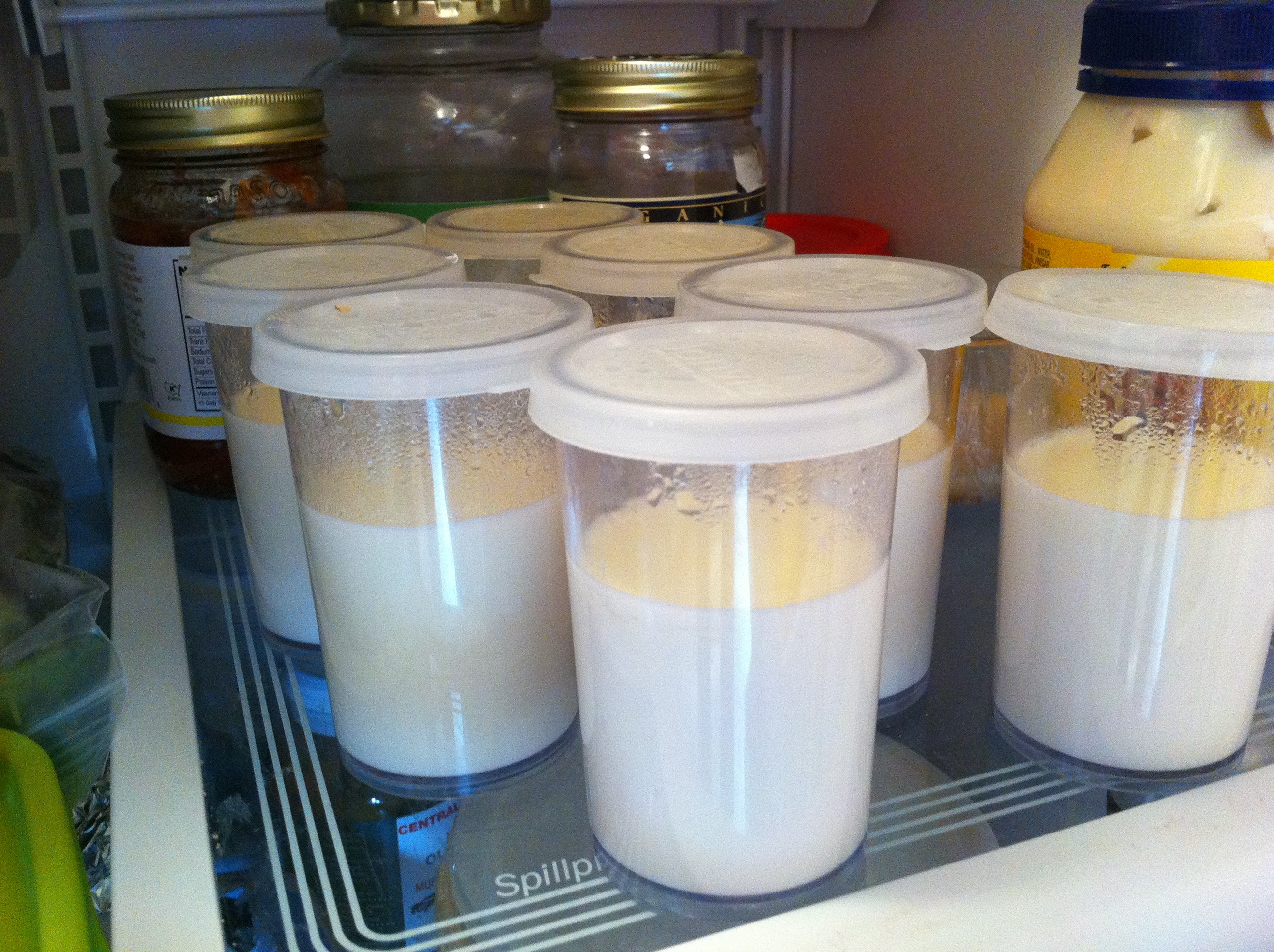 Homemade yogurt isn’t as much of a pain as you might imagine- just heat on stove or in microwave, add starter (a heaping spoonful of existing yogurt), and (if you have a nifty Donvier machine like we do) put in the cooker for a good 16 or 17 hours to cook. After that cool in the fridge for 3 hours. Voila! This fridge shot is a rare sight- this stuff disappears in our house like you wouldn’t believe.