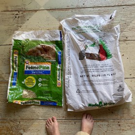 Wood pellets marketed for kitty litter on the left, and for pellet stoves on the right- it’s the same stuff.