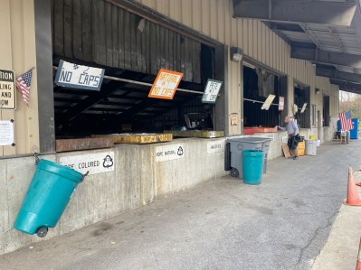 Because I’d always lived in cities with garbage trucks that magically whisked everything away, I’d never before encountered an actual transfer station before. (This is the real name for the dump, which no one uses.) I was a little shocked: residents drive right alongside a series of enormous concrete bays into which we pour our different sorted categories of recycling. If you peer over the edge you can see the cascading piles of stuff on the lower level, a cavernous open space where the trucks of contractors drive in and out, dropping off construction debris. On most days the place is filled with the sounds of crashing metal and breaking glass.