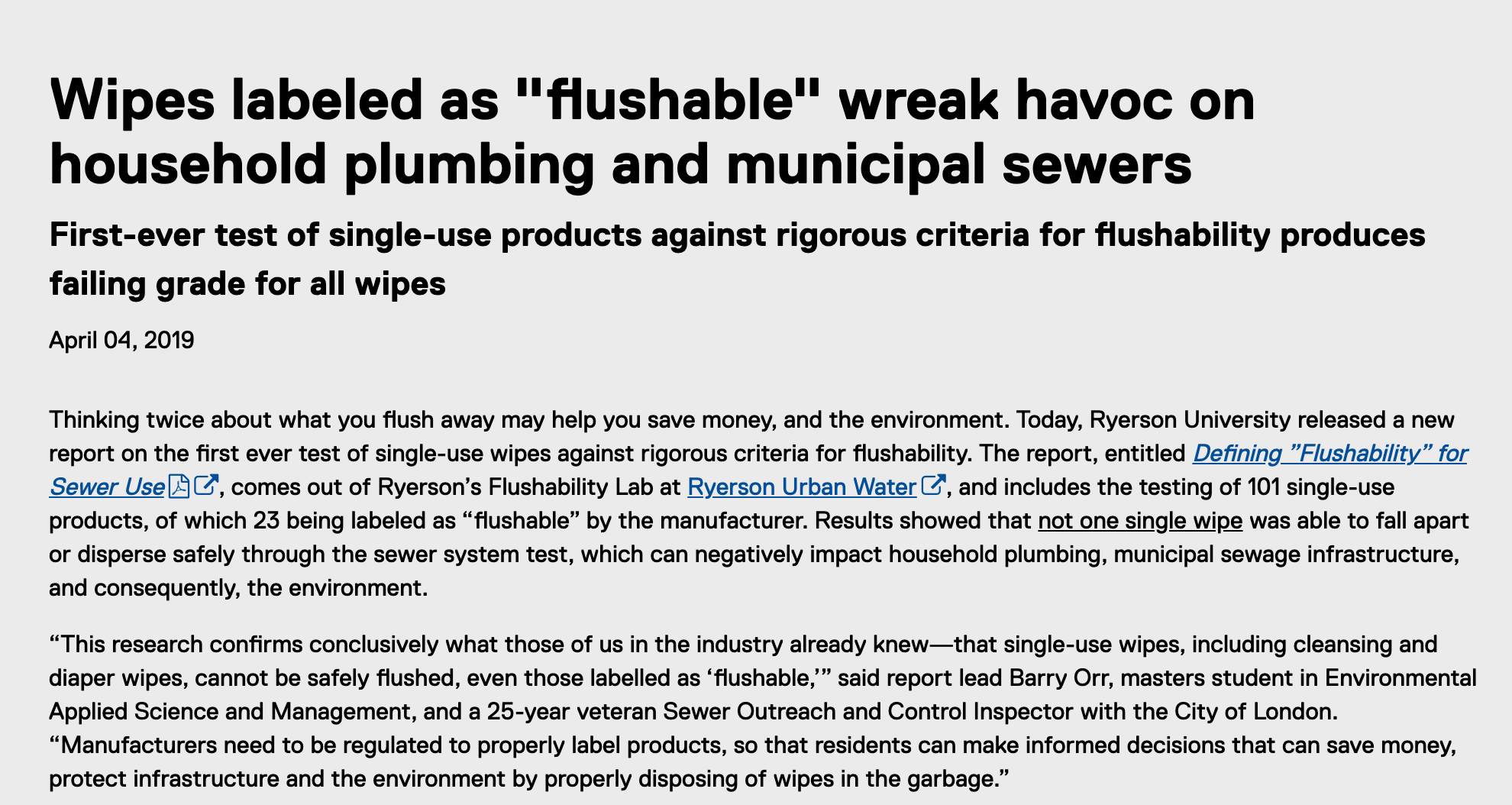 What’s more, in 2019 Forbes conducted an independent study that tested 101 different kinds of wipes, 23 of which were labeled “flushable,” for disintegration and “flushability.”