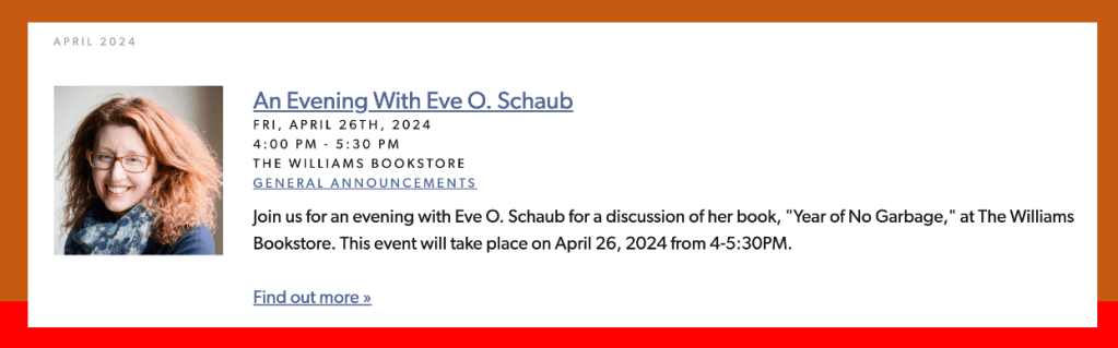 APRIL 30: LEXINGTON, MASS– I’ll be speaking at the Cary Library in partnership with LexZero Waste. (More details coming soon.)
