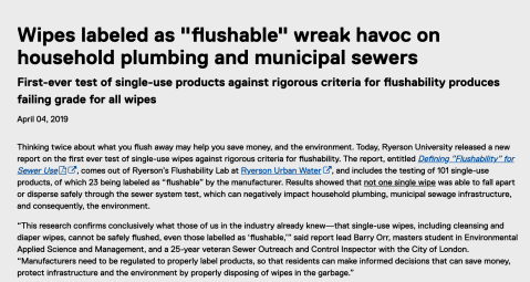 But what about my supposedly “flushable” wipes? It turns out I was right about one thing: any wipe that claims it is flushable can’t contain plastic, which means my Cottonelle’s are different: they are made entirely of paper. However, there is clear disagreement in the plumbing and wastewater community about whether even 100% paper wet wipes break down fast enough to avoid causing problems.