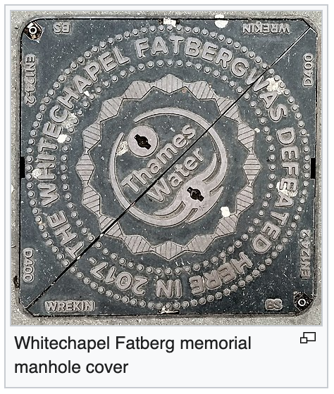 (You can peruse a nice list of “Notable Fatbergs” on Wikipedia. In 2017, excavated pieces of a 140 ton fatberg on display at the Museum of London apparently became one of the museum’s most popular exhibits. )