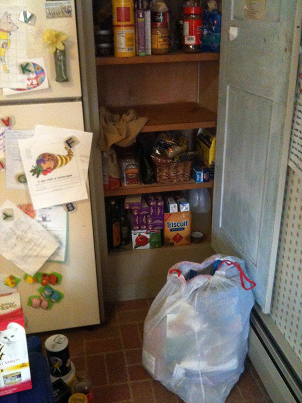 It felt good though. I filled a big bag with cans and boxes to go to the local food cupboard, and my shelves are no longer dusty and disorganized. Treasure-hunt style, I found lots of interesting artifacts: five (count ’em) containers of unsweetened cocoa, several packages of powdered milk, a small bottle of Kalua someone had left here at a party, a two year old box of chocolates, lots of jam and sweet pickles that have been simply shoved to the back of the cupboard all this year, and yes, last year’s Halloween candy.