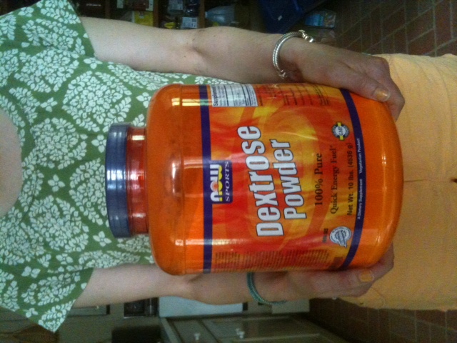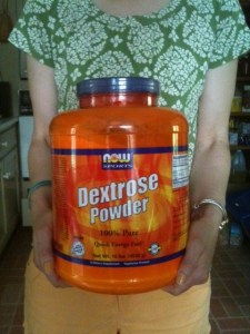 Finding dextrose, however, isn’t as easy as wandering down to your local health food store. After looking high and low I gave up and ordered a ten pound container of the stuff online for about twenty dollars. At last the box arrived and it was… enormous! The orange plastic jar is roughly the size of a beach ball and is packaged similar to those colossal jars of weight-gain powder you see in mall vitamin stores. Seriously? I wondered…